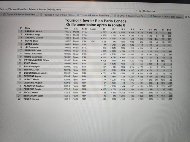 Dimanche 4 Février 2024 Nouveau succès pour le tournoi scolaire de Février ! La fratrie CABASSU se distingue: Victor seul en tête, Gaston médaille de bronze. Hugo ABITBOL médaille d'argent. Eliah MOYAL, 1er Poussin devant Michel LOAEC Bien que proche du précédent tournoi, celui-ci trouvait sa raison d'être dans la proximité des prochains stages,toujours très demandés pour les vacances d'hiver, auxquels il servait d'entrainement. Sans surprise un grand nombre de jeunes ont tenu à en découdre à l'approche des vacances. Un premier bilan de l'année scolaire, donc. On remarque que l'âge n'est plus le facteur déterminant dans le classement: Hugo et Gaston sur le podium sont Petits Poussins, un résultat inimaginable en début d'année, preuve de l'efficacité de leur formation avec ELAN. Le prochain tournoi se tiendra après les vacances de Février, le 10 Mars. Il est déjà en ligne. Bonnes vacances à tous! |