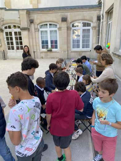 Comme chaque année, la fête de fin d'année en plein air de l'école et du collège de l'Assomption Lubeck, fut l'occasion d'une animation organisée par ELAN sous l'égide de l'association"les Alouettes" de l'école. Michael qui est l'un des professeurs d'Echecs intervenant organisait cette animation de main de maître. Et le succès fut au rendez-vous comme on le voit sur la photo, tant auprès des participants que des "badauds" de la cour de récréation. Cette année encore c'est Valentin qui gagne la coupe du 1er. Tous les participants reçurent une médaille commémorative et nous retrouverons en Septembre. Bonnes vacances ! |